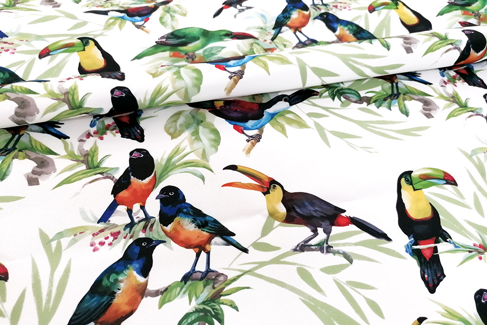 Paradiesvögel zieren diesen Outdoor-Stoff, bringen Sie das Dschungel-Feeling in Ihren Garten. Der leichtere Stoff ist mit Teflon beschichtet und somit fleck- und schmutzabweisend ausgerüstet. Er ist vielseitig einsetzbar, für Segeltücher, Sitzsäcke, Sonnensegel, Sitzkissen, Tischdecken, Vorhänge und vieles mehr. Die Ware kann natürlich auch im Innenbereich eingesetzt werden.