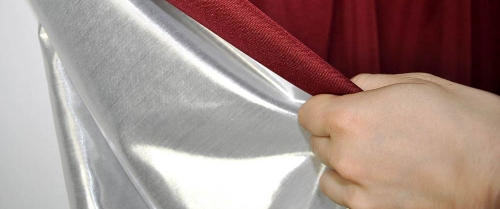 Das Vorhang-Futter besteht aus Polyester und ist auf einer Seite mit Aluminium beschichtet. Dadurch hat es eine matte und eine glänzende Seite.