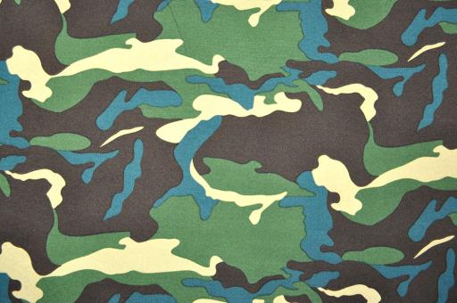 Ein anspruchsloser, leichter Universalstoff, bedruckt mit dem beliebten Camouflage-Muster. Ein toller, pflegeleichter Stoff, vielfältig einsetzbar. Er fällt fließend, ist weich, trotzdem griffig und lässt sich hervorragend verarbeiten. Außerdem ist er sehr pflegeleicht - nasses Aufhängen genügt (kein Bügeln notwendig). Der Stoff ist leicht dehnbar und dadurch ideal für Bekleidung/Kostüme, aber auch Dekorationen wie Kissen, Accessoires aller Art und vieles andere mehr.