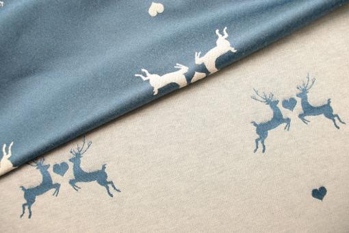 Beidseitig verwendbarer Jacquard aus Baumwollmischgewebe mit herzigem Hirsch-Motiv in Creme/Blau