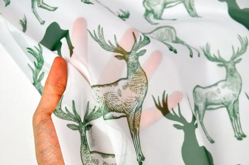 Voile ist ein klassischer transparenter Gardinenstoff. Das feine, geschmeidige Gewebe ist wie geschaffen für luftige Innen- und Fensterdekorationen. Der wunderschöne Hirsch-Print sorgt zudem für ein gemütliches Ambiente. So gelingen sehr schöne Gardinen/Vorhänge, Schals, Stores und viele andere Raumdekorationen. Der Stoff aus Polyester ist pflegeleicht und knitterarm.Hirsch: ca. 13 cm