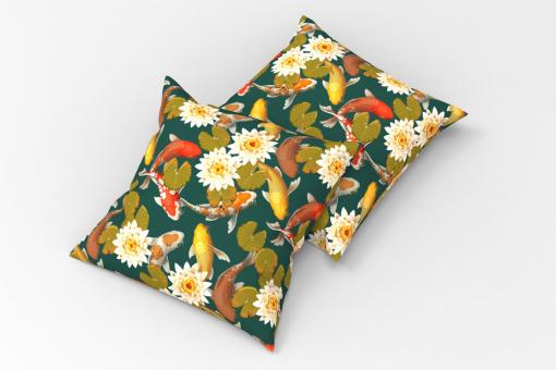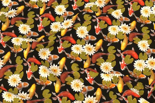 Dieser Stoff ist in der Optik und im Warengriff einem echten Lodenstoff nachempfunden. Ein Kleingärtner-Traum ist auf diesem Stoff nachempfunden. Wunderschöne Koi-Karpfen zieren ihn und ebenfalls dazu passend große Seerosen-Blüten.