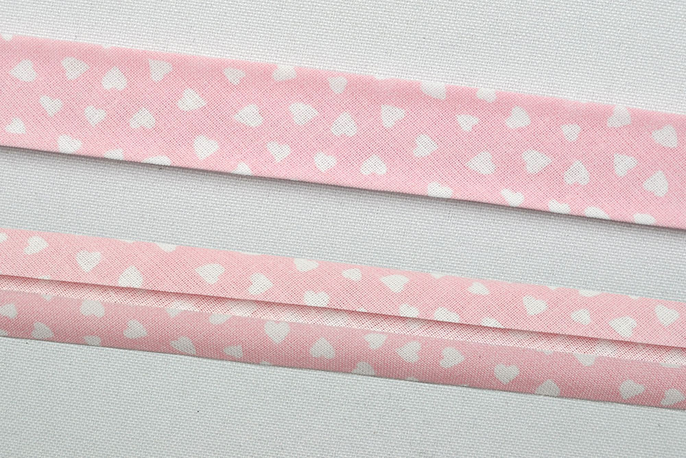 Weiße Herzchen zieren das pastellfarbige Schrägband, vorgefalzt auf 2 cm