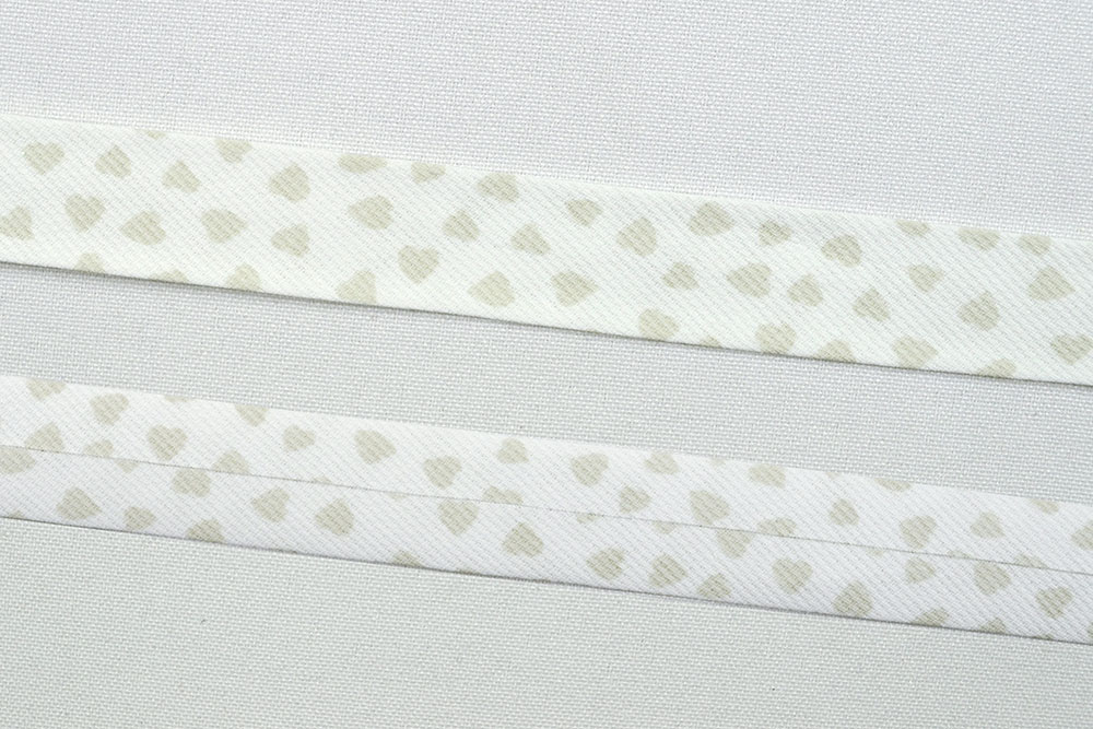 Kleine Herzen in Pastell-Farben zieren dieses weiße Schrägband, vorgefalzt auf 2 cm