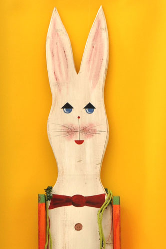 Wer handwerklich geschickt ist, kann sich noch zwei Hasen aus Holz zurecht sägen, die dann über diese hübsche Deko wachen. Ansonsten finden sich diese putzigen Gesellen zur Frühlingszeit auch oft zum Kaufen in Baumärkten oder Deko-Geschäften. Etwas angemalt und ebenfalls mit der grünen Wollkordel versehen, werden Sie zu den Hauptdarstellern dieses Arrangements.
