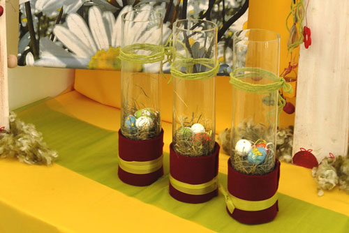 Zu guter Letzt werden die Gläser noch mit Ostergras und bunten Plastik-Eiern gefüllt und ein paar hellgrüne Wollflocken zu Füßen der Hasen verteilt.