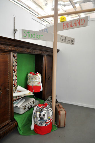 Der Hintergrund in unserem antiken Schrank besteht aus Kunstseide in frischem Frühlingsgrün. Das farbenfrohe Deko-Banner mit den Flaggen verschiedener Länder verströmt ein internationales Flair.