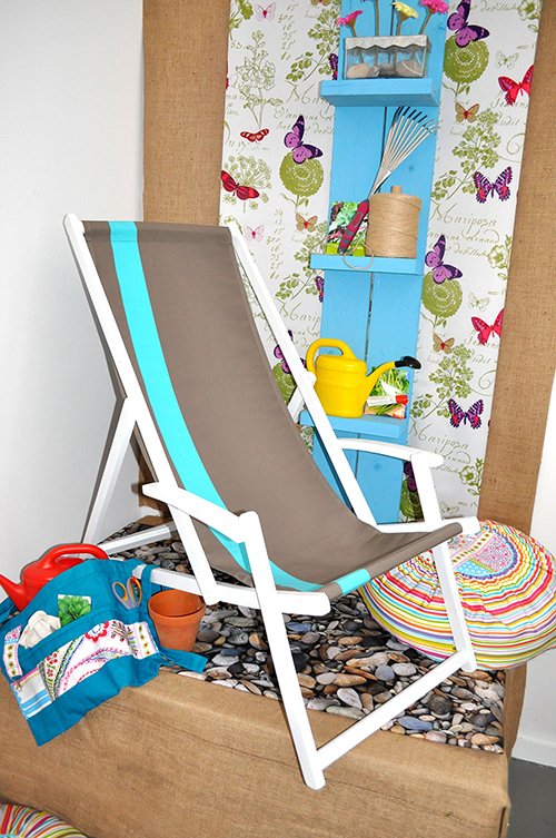 Ihre Grundausstattung zum Relaxen sieht doch nun schon mal ganz gut aus. Wer mag, kann vor dem tollen Schmetterlings-Stoff noch ein Vintage-Regal anbringen, auf dem sich thematisch passende Deko-Elemente unterbringen lassen. Wie wäre es z. B. mit unserer großen Rolle Jutefaden, echtes Seemannsgarn sozusagen? Das sieht nicht nur hübsch aus, sondern lässt sich auch hervorragend für Garten- und Floristikarbeiten verwenden. Auch Ihre eisgekühlten Cocktails finden in dem Regal sicher noch einen Platz in perfekter Liegestuhl-Reichweite.
