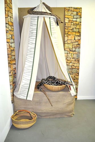 Gefertigt ist das Zelt aus unserem sandfarbigen Segeltuch. Den wilden Look erhält es durch den Jacquard-Stoff Längswellen, der seitlich vom Eingang angebracht ist. Ganz streng genommen ist es gar kein Animal-Print, aber im Zusammenspiel mit den anderen Komponenten wirkt er wie ein Zebrafell. Das dschungelgrüne Schrägband dient gleichzeitg als Einfassung und als schöner Kontrast am Übergang zwischen Dekostreifen und Zeltstoff.