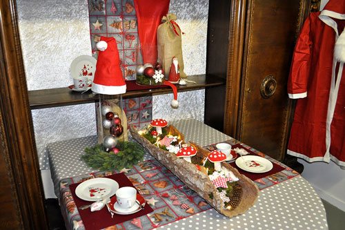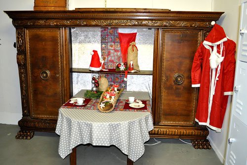 Wer außerdem zum Tisch noch die Umgebung dekorieren möchte, dem verraten wir natürlich auch unsere restlichen Deko-Elemente. Die sichtbare Rückwand des Schrankes ist mit glänzend schimmerndem Pannesamt-Stoff im Farbton Champagner bespannt. Mit dem Banner darüber wird noch einmal der abwischbare Tischdecken-Stoff mit Weihnachtsmotiven aufgegriffen. Da diese Ware 1,40 m breit liegt, lassen sich super zwei 70 cm breite Streifen daraus zurechtschneiden.