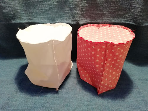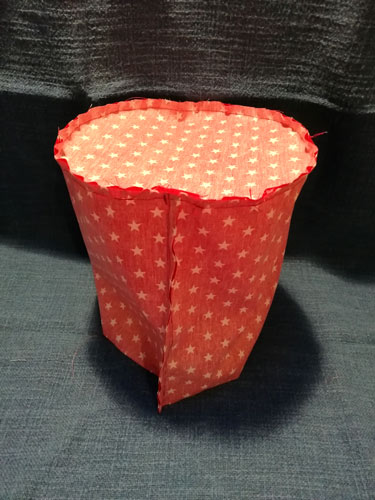 Den Korb aus Innenstoff kann man auf links gedreht lassen. Der Außenstoff wird auf rechts gewendet in den Korb aus Innenstoff gesteckt. Die unschönen, linken Seiten sind nun also zu sehen, die rechten Seiten liegen innen. Die beiden Stoffe an der oberen Kante stecken und anschließend nähen. Hierbei ca. 7 cm Öffnung zu Wenden (Wendeöffnung) frei lassen.