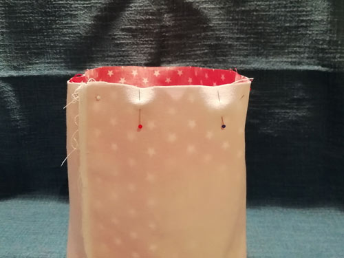 Die beiden Seitenteile des offenen Rechtecks passend aneinander legen und die Stelle der Seitennaht einzeichnen. Den Stoff zusammen stecken und anschließend so nähen, dass ein geschlossener Kreis entsteht, der später auf das runde Stoffstück passt.