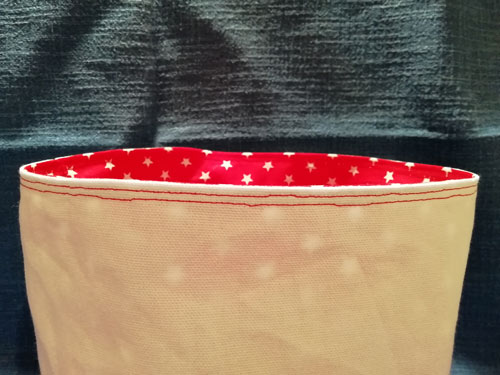 Die obere Kante des Körbchens nun mit der gewünschten Nähgarnfarbe zweimal absteppen und das Körbchen anschließend je nach Belieben wenden bzw. umklappen.