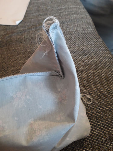 Zupft unten die Ecken auseinander. Die Ecken im Beispiel werden ca. 5 cm groß, d.h. 5 cm abmessen und einmal über die Ecke nähen. Das Ganze auf der anderen Seite wiederholen.