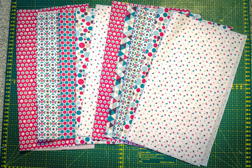 Die Größe der Schnecke könnt ihr frei wählen. Die aus dem Beispiel ist knapp 3 m lang, es wurde hierfür fast das komplette Patchwork-Paket verarbeitet. Da die Patchwork-Zuschnitte jeweils die gleiche Größe (30 cm x 70 cm) haben, habe ich alle halbiert und somit 12 gleich große Stücke in den Maßen 30 cm x 35 cm erhalten.