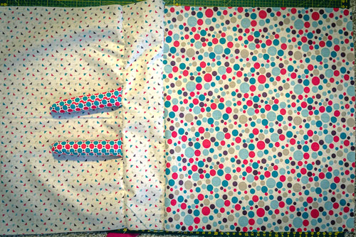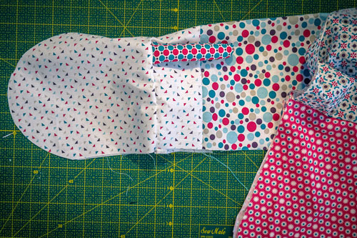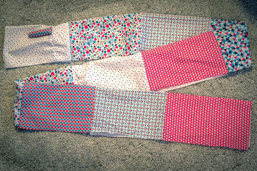 Sind die Fühler erst positioniert, näht es sich ganz ungeniert. Der nächste Schritt ist wirklich einfach. Es werden jetzt nach und nach alle Rechtecke zusammengenäht. Das erste Rechteck ist natürlich das mit den Fühlern. Der 2/3-Teil ist vorn, an den 1/3-Teil wird das nächste Rechteck genäht. Daran dann wiederum das nächste und immer so weiter. Bis man eine lange Bahn von Rechtecken hat.