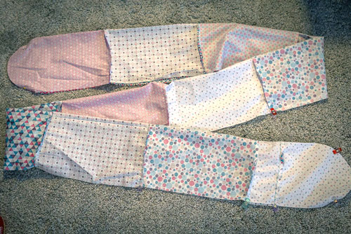 Danach wird die Schlange der Länge nach rechts auf rechts gefaltet und sorgfältig zusammengesteckt. Achtet darauf, dass die einzelnen Rechtecke immer schön übereinander liegen und die Nähte sich treffen, so sind die Übergänge nach dem Wenden schön gerade.