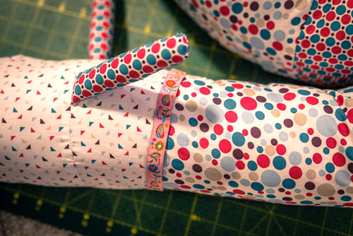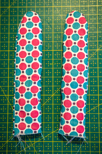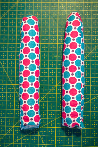 Zuerst werden je zwei Schnittteile für die Fühler rechts auf rechts gelegt, einmal rundherum genäht, nur unten bleiben sie offen. Durch diese Öffnung werden sie mit ordentlich Bastelwatte gefüllt, damit sie einen guten Stand haben.