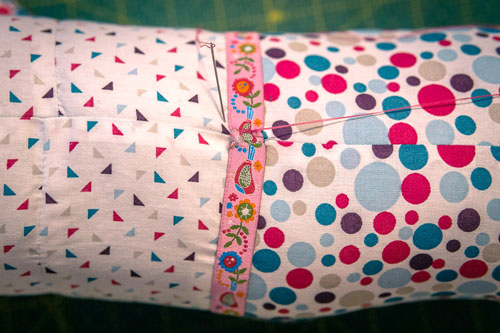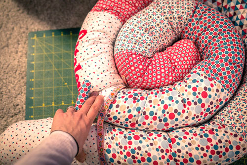 Damit die Bett-Schnecke später auch als solche verwendet werden kann, benötigen wir noch zwei Stücke Webband. Diese sollten so lang sein, wie der Umfang der Schnecke. Am besten legt ihr es einmal drum herum und schneidet es dann plus Nahtzugabe zu. Um die Position zu ermitteln, an der eure Webbänder befestigt werden sollen, muss die Schnecke nun einmal zusammengerollt werden.