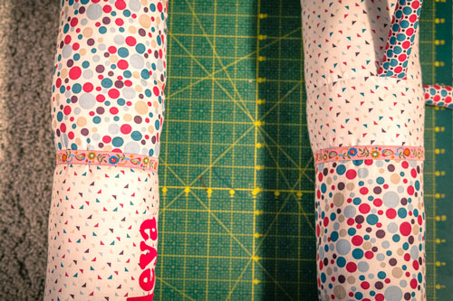 10 Stücke habe ich so zusammengestellt, dass ein schöner Mustermix entsteht, aus einem der anderen beiden Stücke werden jetzt noch die Fühler zugeschnitten. Diese hier sind inkl. Nahtzugabe ca. 4,5 cm breit und 14,5 cm hoch. Die Fühler müsst ihr in der Größe natürlich eurer Schnecke anpassen. Ihr benötigt das Schnittteil hierfür 4 mal.