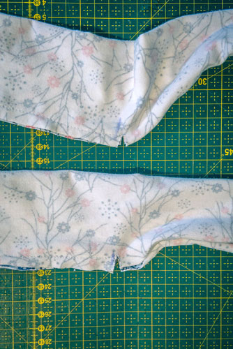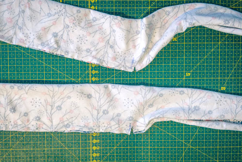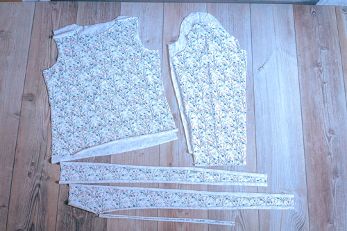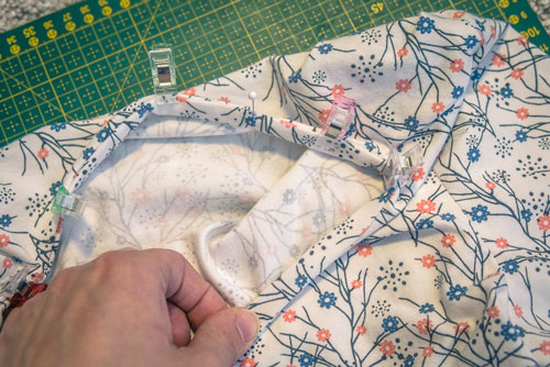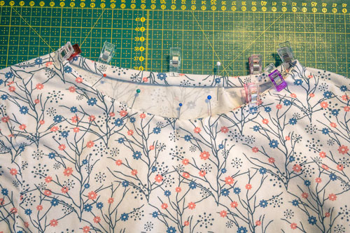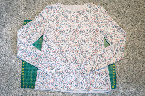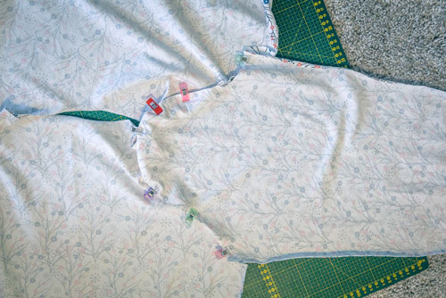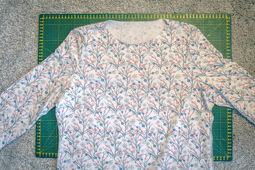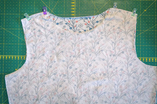 Zuerst werden Vorder- und Rückteil rechts auf rechts aufeinandergelegt und die Schulternähte geschlossen.