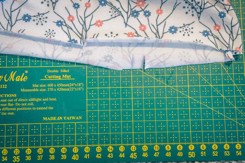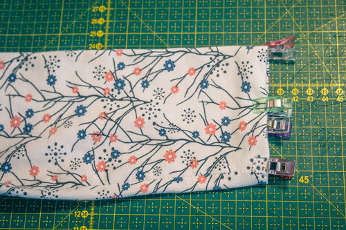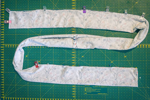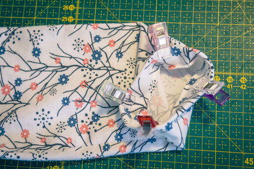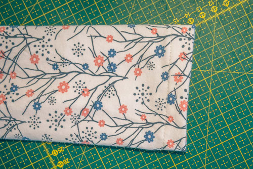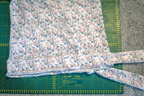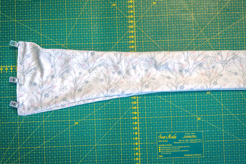 Danach klappt ihr ihn zweimal nach innen, sodass ein sauberer Abschluss entsteht. Auch hier ist wieder etwas Fleißarbeit gefragt, denn damit später beim Nähen alles erfasst wird und ihr eine ordentliche Versäuberung erhaltet, muss gut festgesteckt werden.