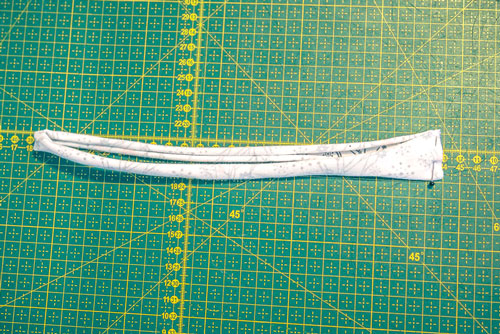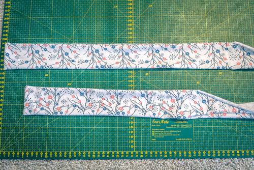 Klappt das Band dann der Länge nach mittig zusammen, sodass die rechte Seite innen liegt. Schließt das Band nun an den Enden. Dies bedeutet, ihr beginnt an der kurzen Seite und näht an der langen Seite bis zu den Markierungen. Diese geschlossenen Enden werden später verknotet, wenn das Shirt fertig ist. Wendet den Streifen nun wieder auf rechts und formt die Ecken schön aus.