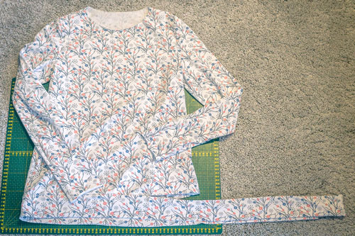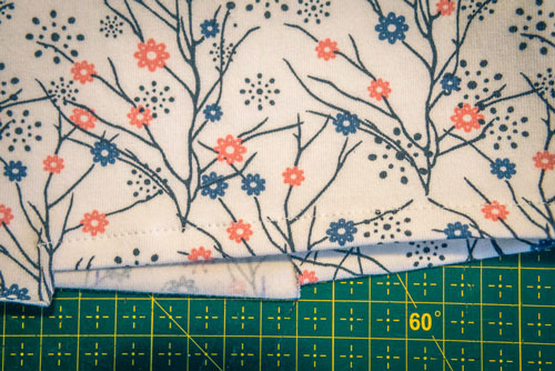 Wenn wir schon beim Säumen sind, tun wir das doch auch gleich noch bei den Ärmeln. Ich ziehe das Oberteil dafür immer kurz an und stecke mir die perfekte Länge ab. Dann werden die Ärmel mit einem Zickzack- oder Zierstich ca. 2 cm breit gesäumt.
