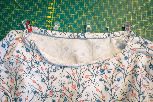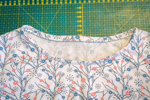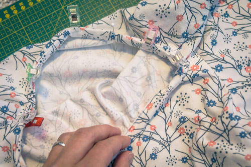 Steckt ihn rechts auf rechts sorgfältig am Halsausschnitt fest und näht dann einmal mit einem elastischen Geradstich drumherum.