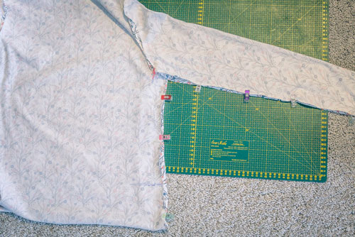 Nach diesem Schritt könnt ihr auch schon die Ärmel- und Seitennähte schließen. Legt das Shirt wieder rechts auf rechts, sodass es aussieht wie ein fertiges Shirt und steckt an den Ärmel- und Seitenkanten gut fest. Am besten legt ihr zuerst die Nähte an den Achseln aufeinander, sodass diese nach dem Wenden schön aufeinander treffen und steckt von da aus den Rest fest. Diese Nähte können nun geschlossen werden.