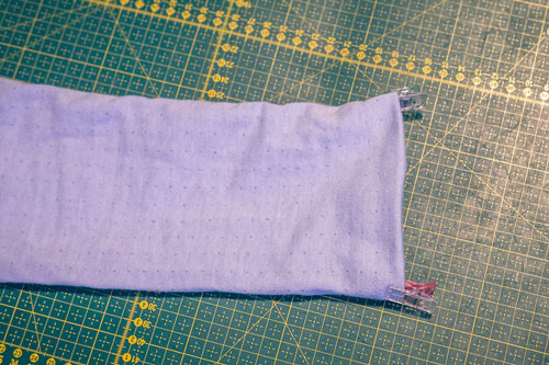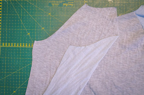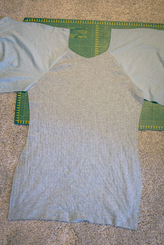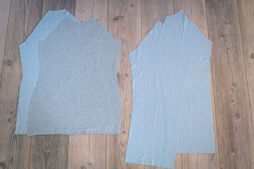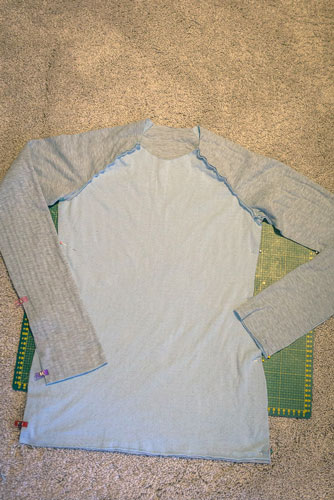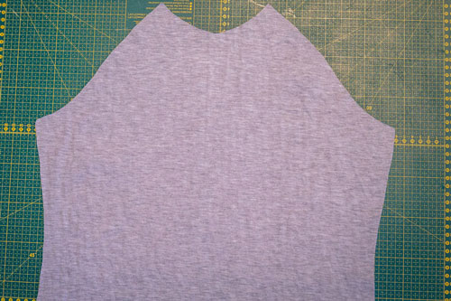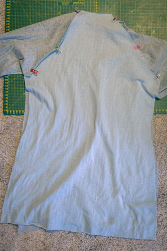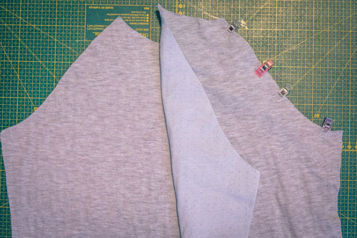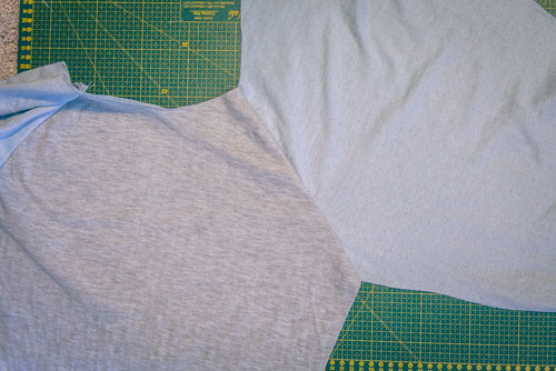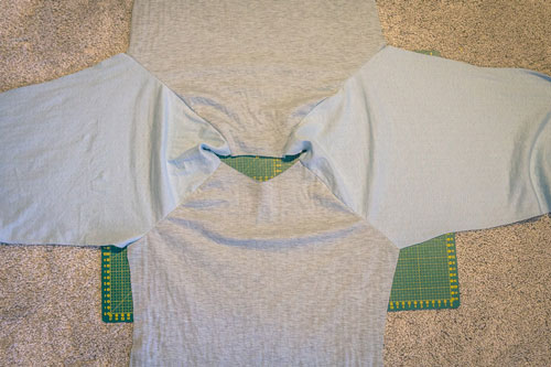 Mit dem Rückenteil und den für das Hinterteil markierten Ärmelkanten verfahrt ihr genauso. Rechts auf rechts feststecken, festnähen und wieder aufklappen. Jetzt sieht das Shirt für einen Moment seltsam aus, aber das gibt sich im nächsten Schritt, wenn wir die Seiten- und Ärmelnähte schließen.