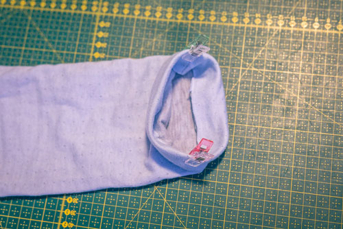 An den Ärmeln und dem Saum messt ihr sorgfältig ca. 2-3 cm rundherum ab und klappt den Stoff soweit nach innen. Gut Fixieren ist hierbei das A und O. Dann näht ihr mit einem Zickzackstich oder wahlweise einer Zwillingsnadel einmal rundherum, um den Saum zu fixieren.
