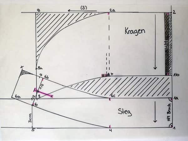 - 2-2a: Rückteilhalsloch am Grundschnitt des Capes ausmessen und auf diese Linie übertragen: hHier 8,5 cm. Ebenso das Rückteilhalsloch bei 1-4, 1a-6c und 1b-1c abtragen.