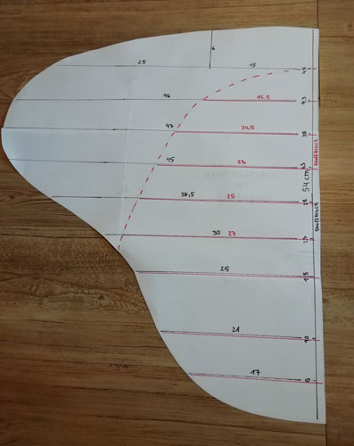 Bevor es mit dem Zuschneiden los gehen kann, übertragt ihr diese Maßangaben auf euer großes Papier und verbindet die unterscherschiedlichen Punkte miteinander. Nutzt dafür, wie vorgegeben, zwei unterschiedlich farbige Stifte, damit ihr später das Hinterteil (schwarze Linie) und das Vorderteil (rote Linie) gut erkennen könnt.