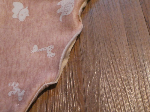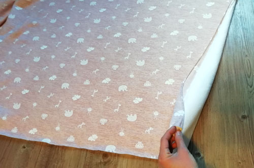 Legt euch den Fleece Stoff (Zoo Tiere) zurecht und faltet ihn rechts auf rechts (schöne Stoffseite auf schöne Stoffseite) so aufeinander, dass ein Stoffbruch entsteht.