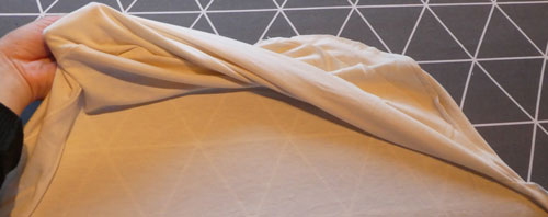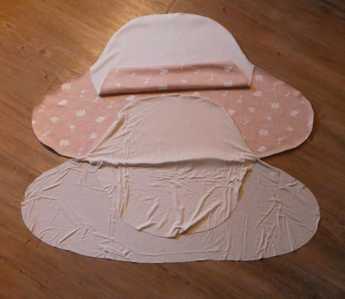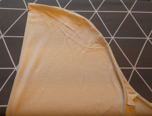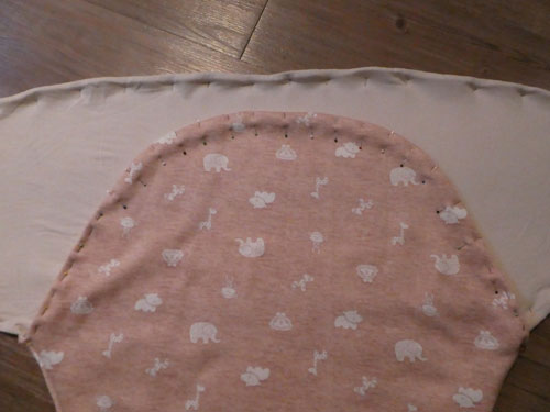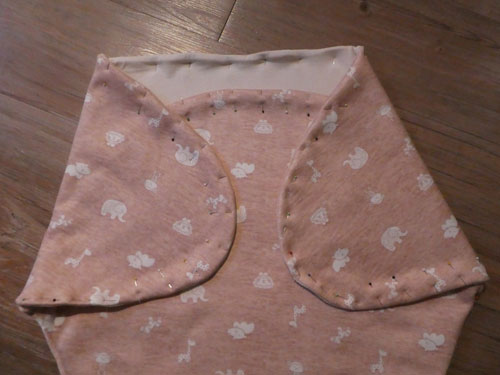 Die beiden Teile liegen also rechts auf rechts (schöne Seite auf schöne Seite) aufeinander und können am unteren Bogen zusammengesteckt werden.