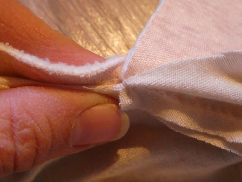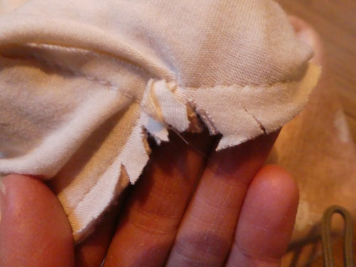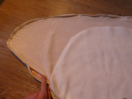 Schneidet die entstandenen "Ecken" an der linken und rechten Seite ein paar Mal ein, damit später nicht zu viel Spannung an diesen Stellen entstehen kann.