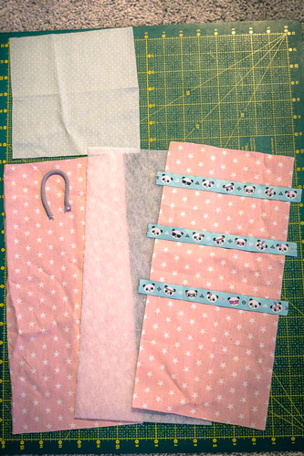 Zuerst wird das Hauptteil aus dem Hauptstoff und der Vlieseline zugeschnitten. Die Größe eures Utensilos könnt ihr frei wählen. Das Haupt-Schnittteil aus diesem Besipiel ist 18 cm breit und 36 cm hoch. Es wird zweimal aus Stoff und einmal aus Vlies benötigt.