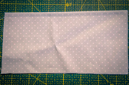 Begonnen wird mit dem Zopfgummi-Täschchen. Das Schnittteil aus Kombistoff wird nun einmal der Länge nach links auf links gefaltet, sodass es 18 cm breit und 10 cm hoch ist. Die schöne Seite des Stoffes liegt außen. Nun steppt ihr die Bruchkante einmal knappkantig mit einem Geradtsich ab. Somit habt ihr zwei Fliegen mit einer Klappe geschlagen: Zum einen erhält man eine versäuberte Oberkante, zum anderen ist das Täschchen jetzt doppellagig und daher stabiler. Dieses Teil ist fertig vorbereitet.