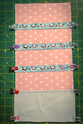 Nun fehlt noch das Webband für die Haarklammern. Im Bespiel sind es 3 Bahnen, je nach Belieben könnt ihr auch mehr oder weniger nehmen. Wichtig ist, dass die Webband-Stücke so lang sind, wie das Hauptteil breit ist. In unserem Fall 18 cm. Um auf Nummer Sicher zu gehen, lieber 1-2 cm länger zuschneiden.