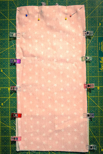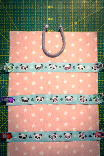 Bereitet damit nun die Vorderseite eures Utensilos vor. Positioniert Webbänder und Zopfgummi-Tasche sorgfältig an den euch passend erscheinenden Stellen und steckt alles sorgfältig fest. Achtet darauf, dass alles schön gerade ist.
