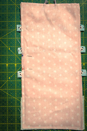 Die Hälfte ist geschafft! Als Nächstes wird die Kordel oben mittig an eurem Utensilo positioniert. Wichtig ist, dass sie beim Zusammennähen nach innen zeigt, damit sie nach dem Wenden außen liegt. Wer auf Nummer Sicher gehen mag, kann nun erst einmal die Kordel und die Webbänder an den Seiten innerhalb der Nahtzugabe feststeppen. So verrutscht nichts, wenn wir Vorder-und Rückseite des Hauptteils zusammennähen.