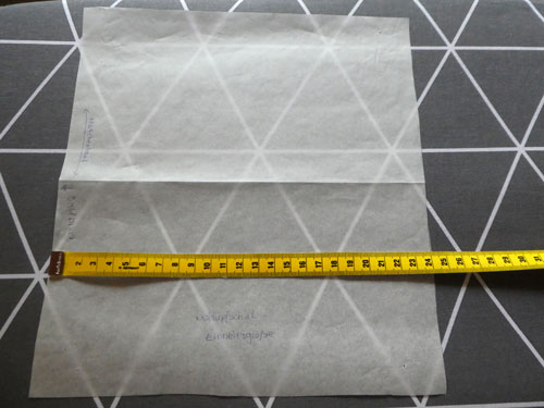 Nun zeichnet ihr einen Strich parallel zur längeren Seite (26 cm) auf. Dieser Strich zeigt euch den Fadenlauf an. Ihr könnt die Markierung auf dem Bild, auf der linken Seite, erkennen.