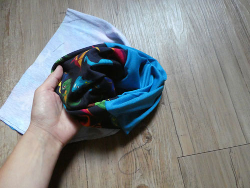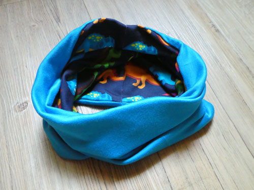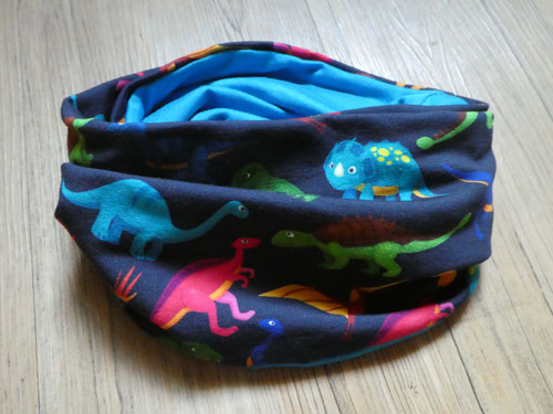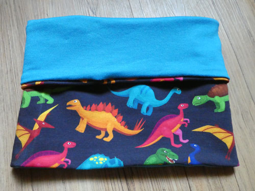 Steckt nun die rechte (schöne) Seite des Dinosaurier-Stoffs auf die rechte Seite des Dinosaurier-Stoffs und die rechte Seite des hellblauen Stoffs auf die rechte Seite des hellblauen Stoffs, sodass man bereits den Loop Schal erkennen kann. Achtet darauf, dass sich die Nähte genau treffen.