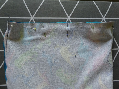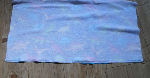 Legt danach den hellblauen Stoff rechts auf rechts auf den Dinosaurier Stoff. Das heißt: Den hellblauen Stoff mit der rechten Seite (schöne Seite) nach oben hinlegen und anschließend den Dinosaurier Stoff mit der rechten Seite (schöne Seite) nach unten auf den hellblauen Stoff legen.