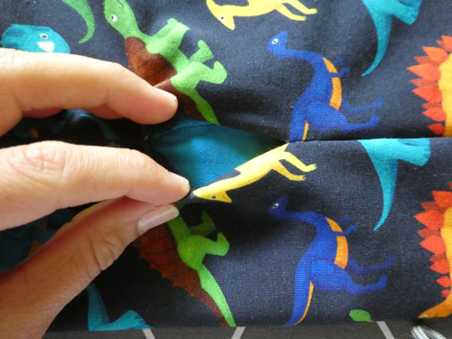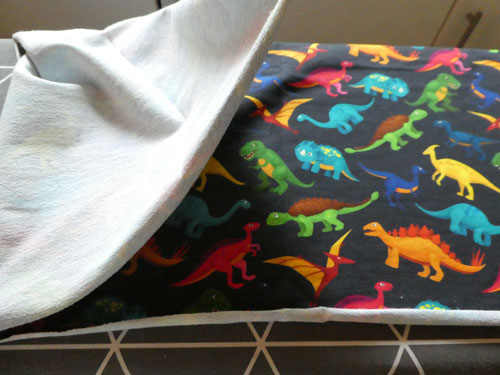 Faltet den Stoff einmal senkrecht. Das heißt, die Dinosaurier schauen zu euch und ihr faltet den Stoff zusammen (ähnlich wie bei einem Buch). Auf den Bildern kann man es gut erkennen.