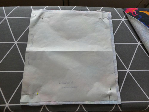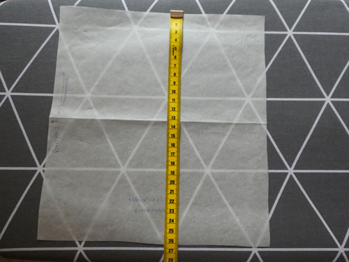 Bevor ihr mit dem Zuschneiden beginnt, erstellt ihr euch ein Schnittmuster. Hierfür braucht ihr das Seidenpapier. Zeichnet mit dem Bleistift ein Rechteck mit den Maßen 24 cm x 26 cm auf und schneidet es anschließend mit einer normalen Schere aus.