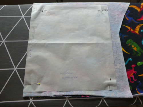 Steckt die beiden Stoffe fest und schneidet den hellblauen Stoff in genau der gleichen Größe wie den Dinosaurier-Stoff zu. Nun habt ihr zwei Rechtecke, die aufeinander gesteckt sind. Diese näht ihr an den beiden längeren Seiten zusammen, sodass eine Art Tunnel entsteht.