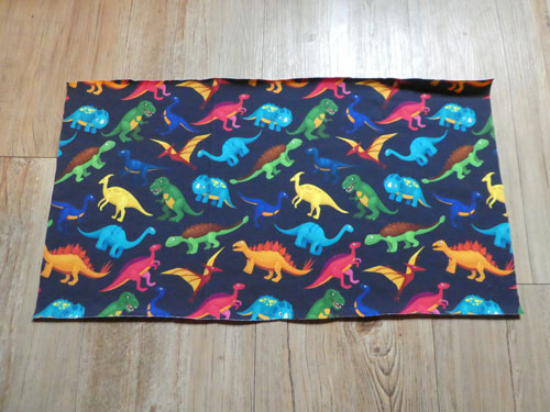 Nun könnt ihr euch den Dinosaurier Stoff zurecht legen. Falls der Stoff faltig ist, wäre es gut, wenn ihr ihn noch einmal bügelt, bevor ihr mit dem Zuschneiden beginnt.