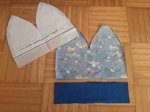 Schneidet den Schnitt aus und legt ihn auf den Stoff. Schneidet die zwei Teile zu. Für das Bündchen könnt ihr ein Rechteck mit dem Umfang des Kopfes (Bündchen-Stoff liegt meist im Schlauch und kann somit im Bruch zugeschnitten werden) aufzeichnen. Soll die Mütze nicht rutchen und eher enger sitzen, kann man bei dehnbarer Bündchenware auch den Kopfumfang mit 0,8 multiplizieren. Somit wird das Bündchen etwas kürzer, muss gedehnt angenäht werden und hält somit besser am Kopf. Die Breite des Bündchenstreifens ist mit 6-8 cm ideal, da es später ja noch umgeklappt wird und somit nur noch halb so hoch ist. Schneidet nun also noch das Bündchen dementsprechend zu.